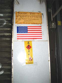 What I did not do was go to Ground Zero. I simply didn't feel the need to. In New York, Ground Zero is pretty much wherever you go, and "9/11" isn't a date, but a constant presence, from the first sign you see at the airport indicating Manhattan, depicting its skyline, with ribbons emblazoned over the twin towers, to the flags fronting almost every apartment building on the Upper West Side. Asked how long it took for New Yorkers to get back to some semblance of "normal," friends would say that it's an ongoing process. Their memories are still vivid. Several reminded me that the last time they saw me at a book reading, it was at Borders on the ground level of the World Trade Center, in late 1999.