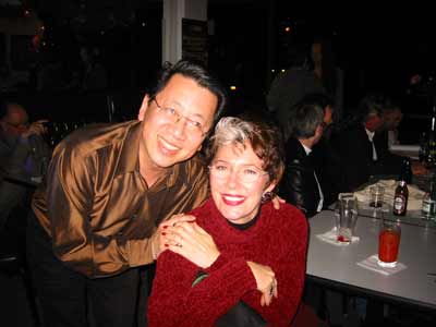 Tuesday, which is my regular biweekly night at the Yet Wah. Since it was my birthday, Dianne, my wife, joined me. Kimberlye, a singer-songwriter and columnist for a local paper, the SF Herald, who�s been part of the karaoke krew for a year, brought her mom, Doris Goldberg, her brother, and his girlfriend. By chance, my sister Shirley, operator of the popular Wok Wiz Chinatown tours, decided to bring a group of visitors in. Soon enough, there were a dozen people at our table, a cake materialized (as they often will at the Yet Wah), and, as the Chinese say, voila! A party!