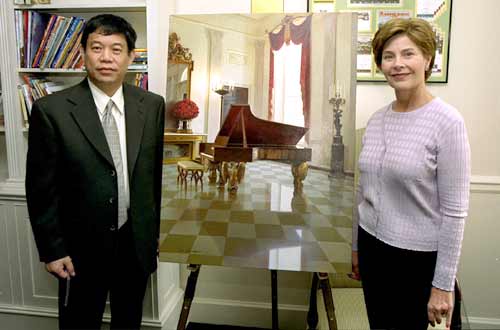 Laura Bush welcomes artist Lu Zhan Huan to the White House when
