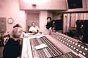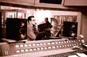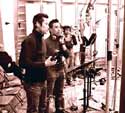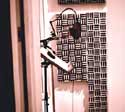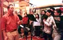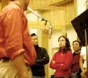 at the mikes. While the orchestra takes a break, Hugh Fordin gives