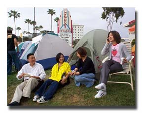 team members Wendy Chan and Mike Kai visit campers waiting to be