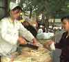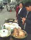 fresh sheepskins, Muslim men from Kazakhstan hawking squewers of barbequed