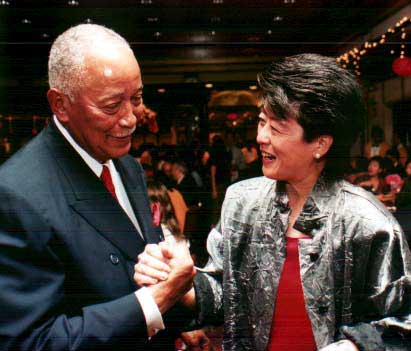 mayor David Dinkins congratulates Helen Zia.