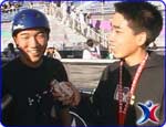 Summer 2000 X Games AC Team's Mike Kai interviews gold and silver medalists for aggressive inline-skating, Eito and Takeshi Yasutoko.